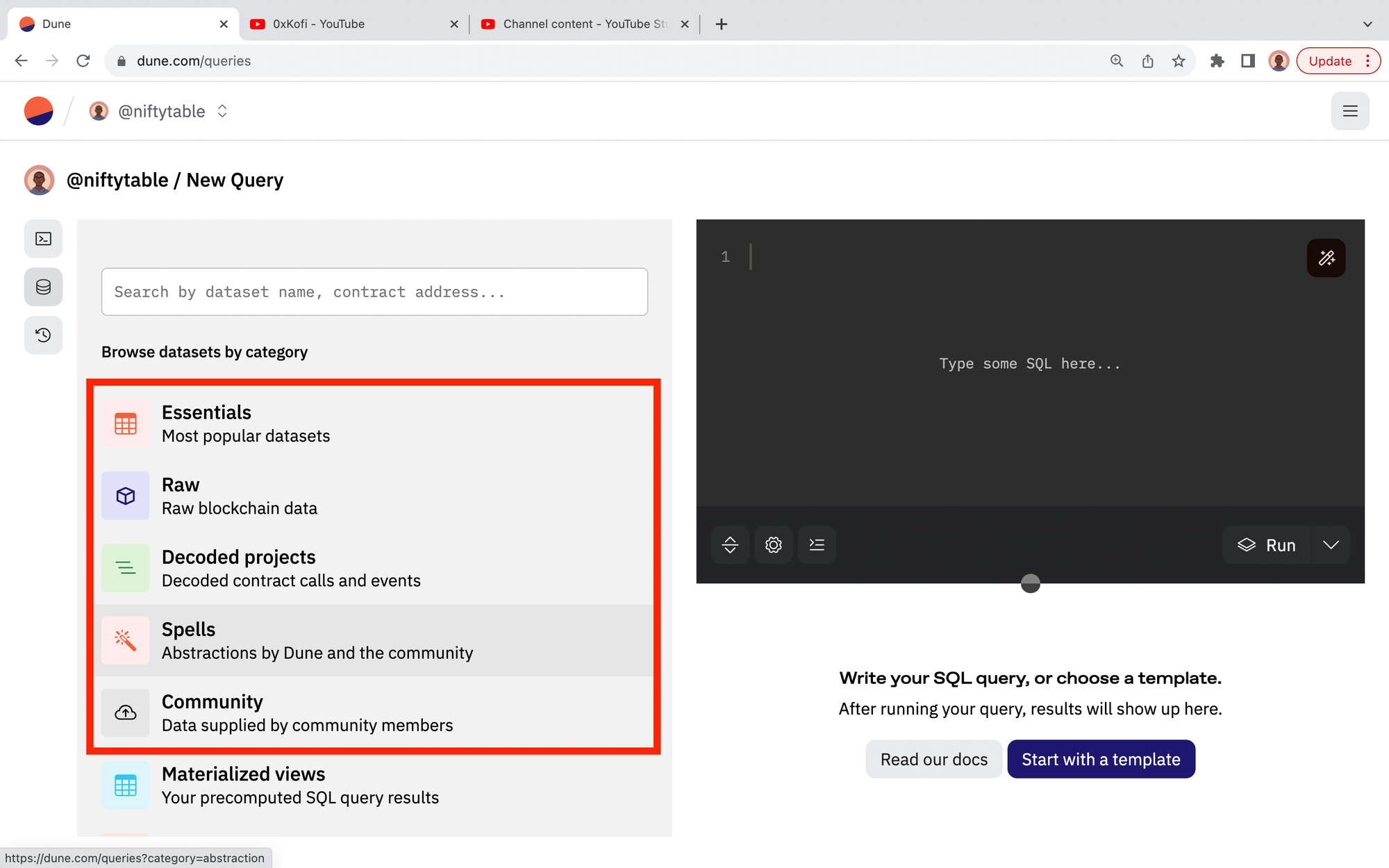 - Community: Datasets produced by third-party teams that bring off-chain data to Dune.