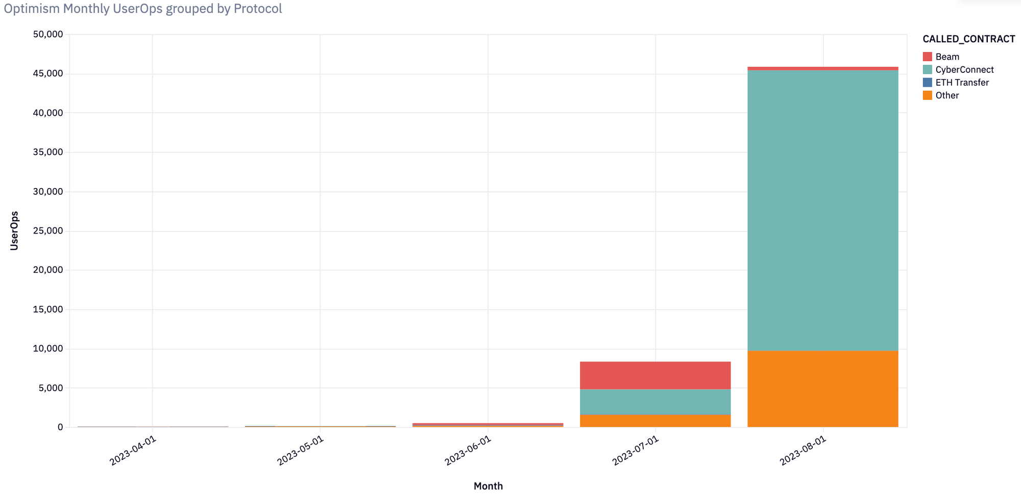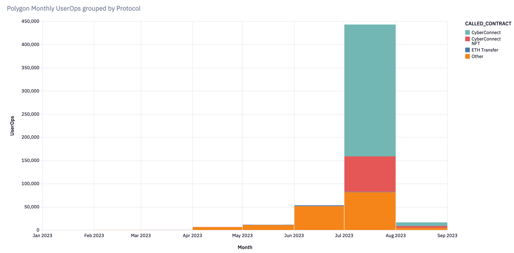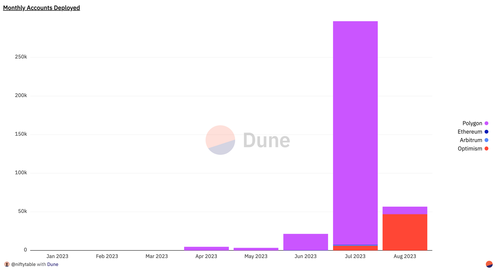 In July, Polygon experienced a massive spike in ERC-4337 usage due to the launch of CyberConnect, a social network where all accounts are ERC-4337 wallets. CyberConnect drove around 360,000 UserOps in July alone.