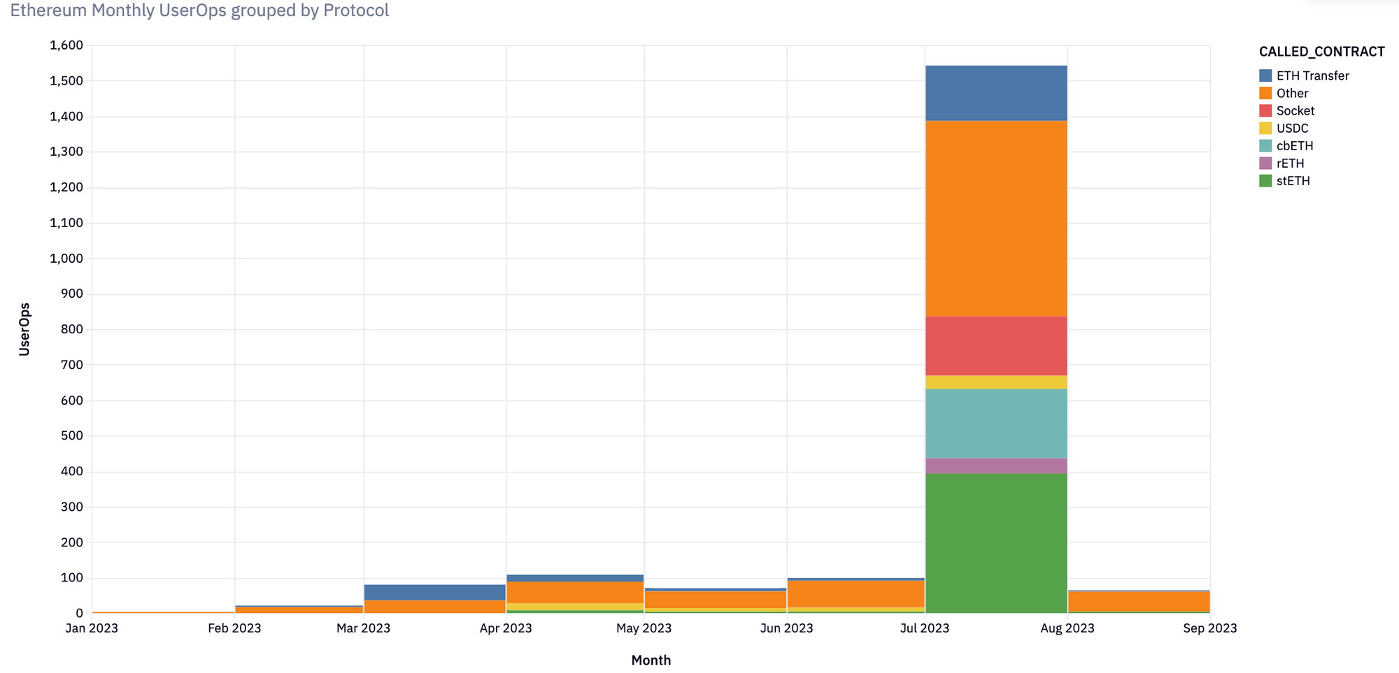 A big chunk of the smart account activity on Ethereum has been centred around liquid staking. In July, 41% of UserOps were generated by users minting and transferring stETH, cbETH, and rETH.